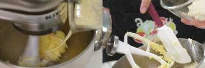 ![]() | ![]() Đổ hỗn hợp lòng đỏ trứng vào âu bơ rồi dùng máy đánh trứng đánh cho quyện đều, tiếp đến thêm creamcheese vào, trộn đều. |