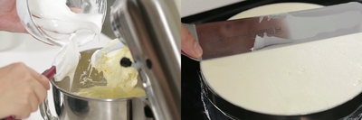 ![]() | ![]() Sau đó cho ½ số lòng trắng trứng đã đánh bông vào, trộn đều rồi mới cho hết số lòng trắng trứng còn lại vào, trộn đều lần nữa. Cuối cùng đổ hỗn hợp vào khuôn ring tròn đường kính khoảng 16-18cm và để trong tủ lạnh 30-45 phút. |